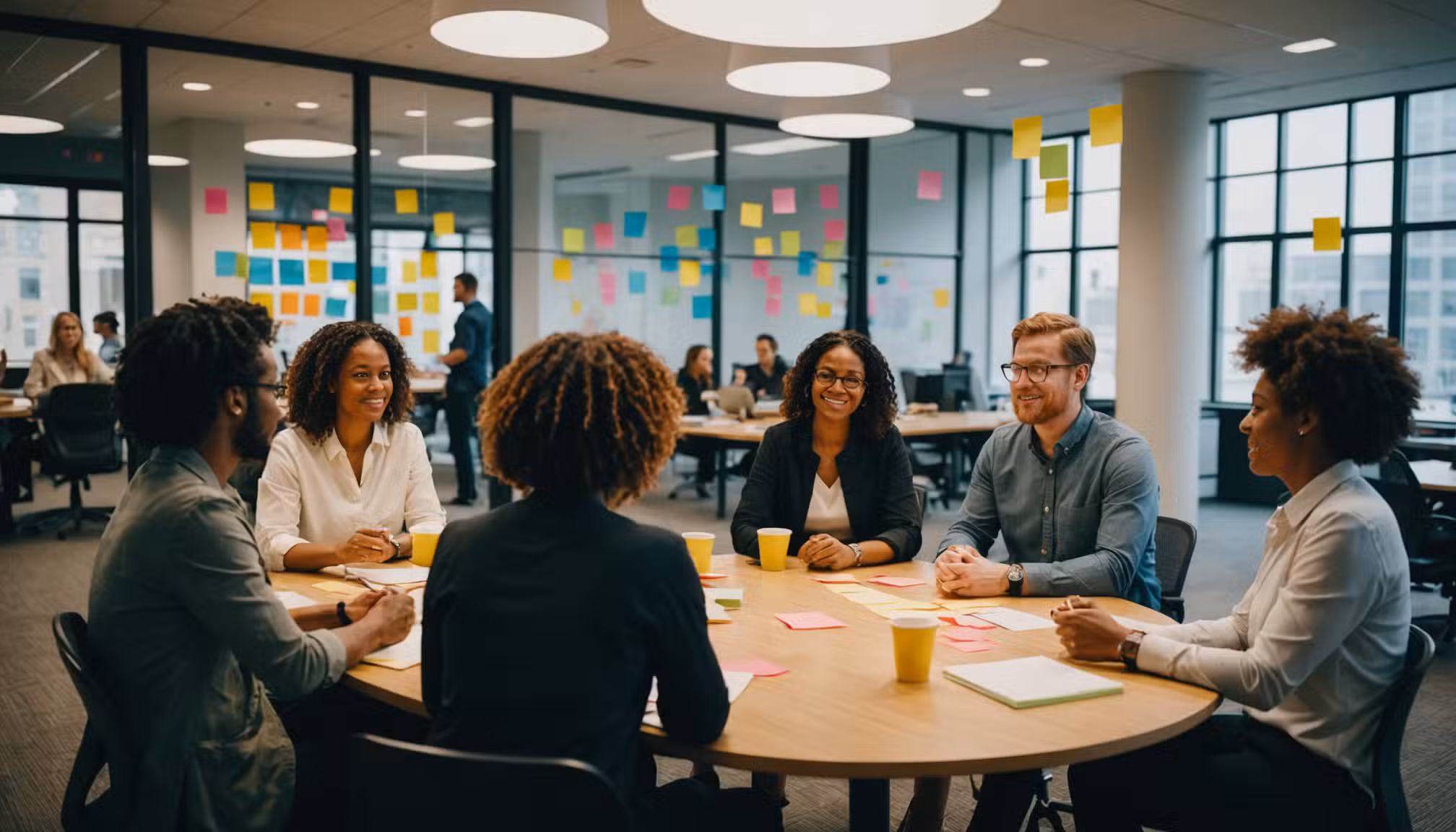 Diverse team engaged in vibrant, collaborative brainstorming session.